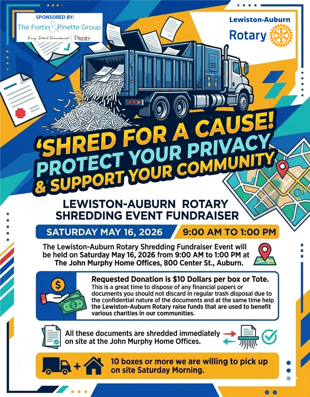 The Lewiston-Auburn Rotary Club is holding a ‘Shredding Fundraiser” on Saturday, May 16 in the parking lot of the John F. Murphy Homes Office at 800 Center Street in Auburn.
